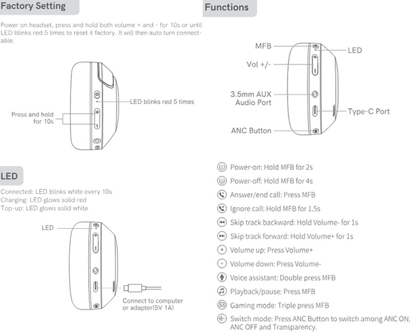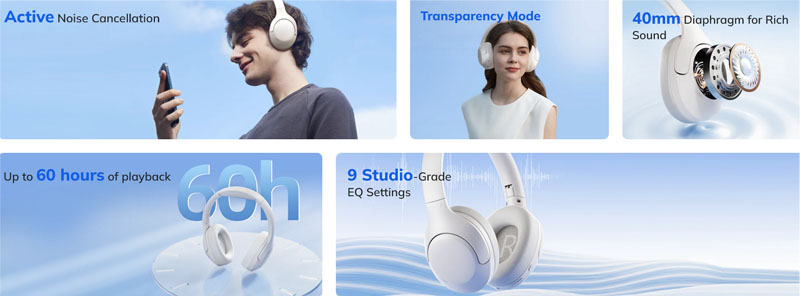 ➤Noise Cancelling Headphones:ACTIVE NOISE CANCELLATION TRANSPARENCY MODE:Active noise cancelling blocks out 90% noise and immersive yourself in superior sound anywhere. Activate transparency mode allows you to hear ambient sound without taking off the headphones.