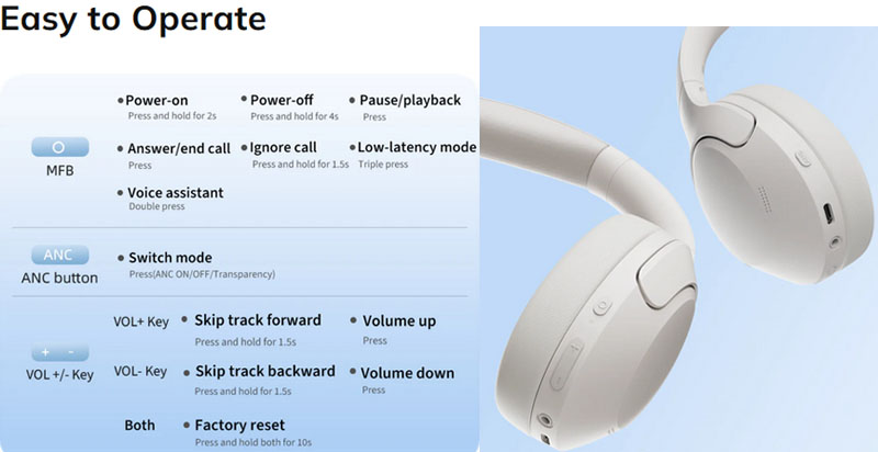 Playback time: approx. 60/50hr(ANC OFF/ON)