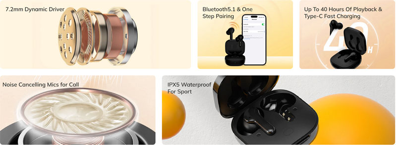 7.2mm driver delivers HIFI sound combining punchy bass and dynamic,transient analytic force.That's how T13 offers immersive experience and become your private mobile cinema.